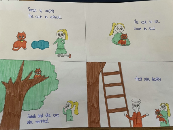 南關(guān)小學(xué)六年級(jí)的孩子們?cè)趯W(xué)習(xí)完《Unit6Howdoyoufeel?》之后,開始探索英語(yǔ)故事中各個(gè)角色的內(nèi)心世界。南關(guān)小學(xué)的英語(yǔ)老師適時(shí)對(duì)孩子們進(jìn)行了特色作業(yè)設(shè)計(jì)——讓孩子們自己去設(shè)計(jì)英語(yǔ)學(xué)習(xí)資料,設(shè)計(jì)自己的英語(yǔ)“小繪本”。一時(shí)間,孩子們發(fā)散思維進(jìn)行了“頭腦風(fēng)暴”,孩子們覺(jué)得“feel”其實(shí)在各個(gè)場(chǎng)景中都有所體現(xiàn),于是,依據(jù)課本上的六個(gè)單元話題,孩子們開始了自己的手繪英語(yǔ)連環(huán)畫之路。經(jīng)過(guò)三天的設(shè)計(jì)與繪畫,孩子們的作品如約提交。我們看到,孩子們?cè)诶L畫的同時(shí),更是充分應(yīng)用了六年級(jí)上學(xué)期學(xué)習(xí)的諸多實(shí)用句型,編制成一個(gè)個(gè)生動(dòng)地小故事為繪畫增光添彩,愉悅身心地同時(shí)又鞏固了英語(yǔ)專業(yè)知識(shí)。