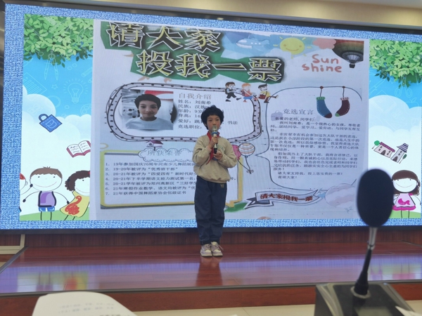 競選分為演講、答辯、才藝展示三個環(huán)節(jié)。在競選演講中,候選隊員們個個充滿自信,熱情高漲地闡述了自己對黨的熱愛、對少先隊工作的熱情和向往。