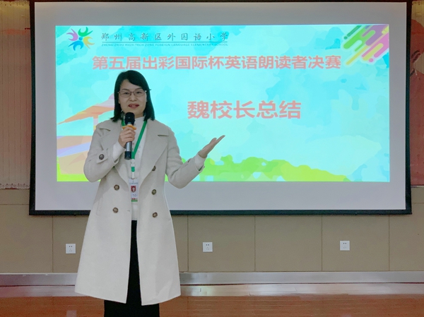 最后,外國語小學(xué)教學(xué)副校長魏艷進(jìn)行精彩的點(diǎn)評和總結(jié)。魏校長夸贊道,今天站在決賽舞臺上的每一位學(xué)生都是最閃亮的星,并對本次活動給予了高度的贊揚(yáng),也對“雙減”政策下的英語教學(xué)工作提出了寶貴的意見。她表示,愿外小所有的出彩果兒都能在活動中不斷體驗(yàn),在鍛煉中學(xué)好英語,與更多的智者對話,了解世界各地不同的文化,增長自己的見識。