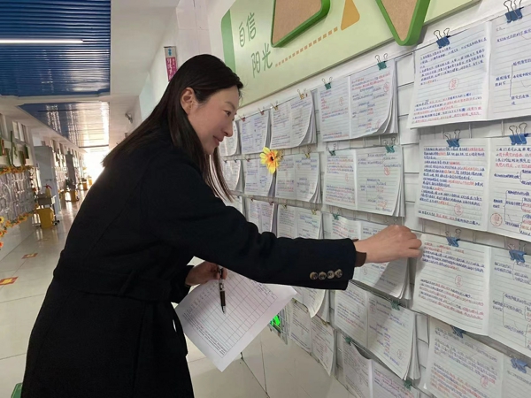 韓輝校長為優(yōu)秀作品貼小紅花