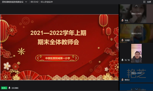 中新河南網(wǎng)1月24日電(吳勇強(qiáng))“驚風(fēng)飄白日,光景馳西流。”伴隨著冬日的雪花,本學(xué)期的各項(xiàng)工作已進(jìn)入尾聲,1月23日,西悅城第一小學(xué)教師相聚云端,召開(kāi)2021-2022學(xué)年上期期末全體教師會(huì)。