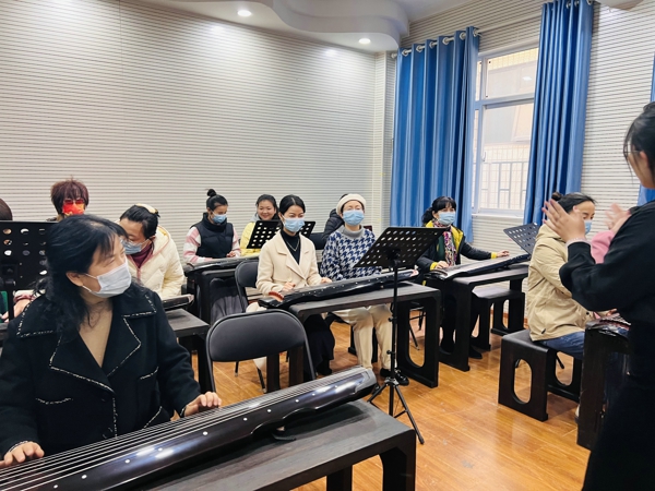 開(kāi)班儀式結(jié)束后,古琴教師對(duì)參與學(xué)習(xí)的老師們彈奏時(shí)的指法、節(jié)奏進(jìn)行了細(xì)致輔導(dǎo),讓一些從未接觸過(guò)古琴的老師體驗(yàn)到了彈奏古琴的樂(lè)趣。不少平日手捧書(shū)本的老師此刻輕挑琴弦,悠揚(yáng)的旋律如同潺潺流水,回蕩在教室上空。