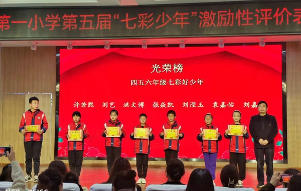 儀式開始,老師和學(xué)生們共同觀看評價總結(jié)視頻,回顧上學(xué)期“七彩少年”激勵性評價開展的精彩瞬間。