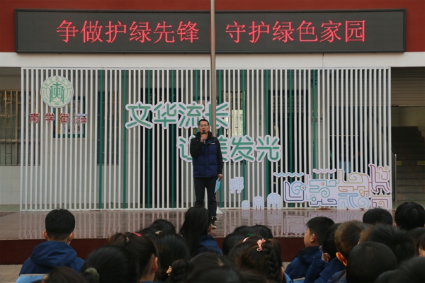 在主題升旗儀式上,該校大隊(duì)輔導(dǎo)員王曉杰倡議大家積極行動(dòng),用實(shí)際行動(dòng),踐行愛(ài)綠護(hù)綠的決心。
