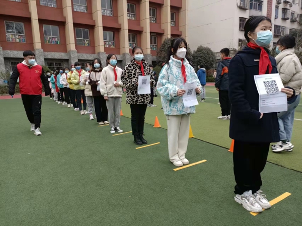 21日上午8:50,大隊輔導(dǎo)員李翠老師統(tǒng)一調(diào)配,王瑩瑩、陸政兩位老師用心組織提醒,學(xué)生們自覺對照地面標識,保持好一米間隔,全程佩戴好口罩,進行核酸檢測,檢測完畢后學(xué)生有序回班。