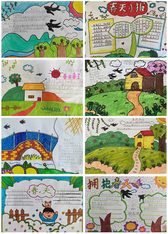 孩子們來到戶外,他們用眼睛作相機,用畫筆記錄下春的印記,他們用心靈用文字歌頌春天、贊美春天。孩子們的作品上,長長的柳條,在春風中蕩起了秋千;嬌艷欲滴的海棠花,散發(fā)著迷人的清香;五彩繽紛的郁金香隨風搖曳,讓人沉醉。孩子們將他們收入眼底,作為自己收集春天的素材,用稚嫩的畫筆精心描繪。孩子們在一幅幅的圖畫中,你一言我一語地訴說著自己對春的熱愛,有的還活學活用一年級下冊語文園地中的四字詞語搭配。欣賞他們的作品仿佛是一種享受,讓我們看到雙減下一群快樂的最美少年。