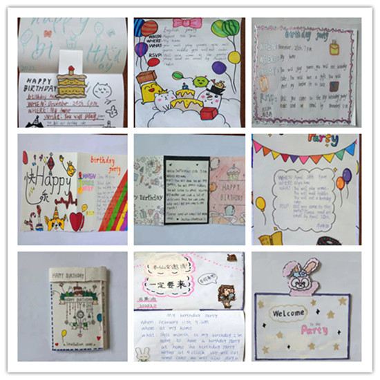 其中三年級(jí)英語(yǔ)以第四單元Atthezoo為主題,學(xué)生繪制了高矮胖瘦不同的動(dòng)物,并介紹其長(zhǎng)鼻子小眼睛等細(xì)節(jié)特征。四年級(jí)英語(yǔ)以Atmyfarm為主題,巧妙布局的同時(shí)加入蔬菜和動(dòng)物等手繪圖片及英文單詞,同學(xué)們奇思妙想,呈現(xiàn)出一幅幅美輪美奐的農(nóng)場(chǎng)景象。五年級(jí)以"我的生日邀請(qǐng)函"為主題,學(xué)生們個(gè)個(gè)熱情高漲,充分展現(xiàn)了自己的繪畫天賦以及無(wú)限的創(chuàng)造力,學(xué)生們的作品制作精美,處處顯現(xiàn)著他們的用心。通過這次活動(dòng),學(xué)生們不僅學(xué)會(huì)了邀請(qǐng)函的書寫格式,也極大的激發(fā)了學(xué)生學(xué)習(xí)英語(yǔ)的興趣。