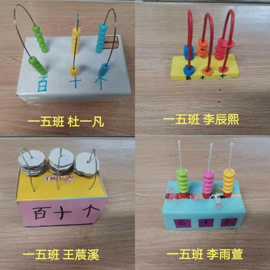 為了提高孩子的動手能力,培養(yǎng)他們的創(chuàng)新思維,更好的讓孩子認識100以內(nèi)的數(shù),一年級數(shù)學(xué)組開展了自制學(xué)具-----制作計數(shù)器的活動。孩子們利用各種各樣的材料,變廢為寶,大膽設(shè)計。通過操作,學(xué)生初步理解個位、十位、百位的名稱和順序。讓孩子動手操作,在計數(shù)器上撥出珠子,知道這些數(shù)是由幾個十和幾個一組成的。并說出同一個數(shù)在不同的數(shù)位上表示的意義。同時讓孩子讀出計數(shù)器上的數(shù),知道讀數(shù)和寫數(shù)都是從高位起。孩子們在制作中體會快樂,在快樂中收獲知識,真正做到了玩中學(xué),樂中學(xué)。