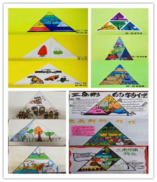 等腰三角形是四年級下冊第五單元所學(xué)的內(nèi)容之一,學(xué)生利用A4紙根據(jù)等腰三角形的特征,發(fā)散思維將等腰三角形又分成不同種類的三角形,并以繪畫的形式把三角形進行裝扮,通過學(xué)生們自定主題、繪畫,將等腰三角形裝扮的更加美觀!四年級的“學(xué)子們”們積極參與活動,每個人都變身小小設(shè)計師,發(fā)揮自己充分的想象,分別將等腰三角形裝扮成自己喜歡的樣子,大家一起來欣賞我們的作品吧!