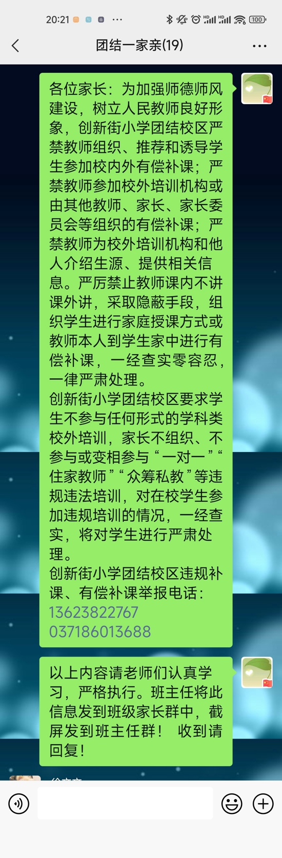 支部書記李莉娟向老師們提出了明令禁止,提出了師德師風的相關要求,嚴禁教師組織、推薦和誘導學生參加校內(nèi)外有償補課;嚴禁教師參加校外培訓機構或由其他教師、家長、家長委員會等組織的有償補課;嚴禁教師為校外培訓機構和他人介紹生源、提供相關信息。禁止教師課內(nèi)不講課外講,采取隱蔽手段,組織學生進行家庭授課方式或教師本人到學生家中進行有償補課,一經(jīng)查實零容忍,一律嚴肅處理。隨后,各班班主任將內(nèi)容和舉報電話轉發(fā)至家長群當中,歡迎家長的監(jiān)督。