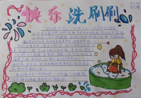 同學(xué)們?cè)诰W(wǎng)課學(xué)習(xí)之余,還當(dāng)起了“家務(wù)小能手”,做自己力所能及的家務(wù)勞動(dòng),各盡所能,各盡所職干好自己的活兒。經(jīng)過(guò)學(xué)校的前期安排部署,三四年級(jí)同學(xué)們以“快樂(lè)洗刷刷”為主題,感受勞動(dòng)的快樂(lè)。瞧,同學(xué)們認(rèn)真洗衣服的模樣可真美!在刷子的揮舞下,書(shū)包和鞋子也煥然一新,變了模樣。看著自己的勞動(dòng)成果,孩子們臉上綻放出滿意的笑容。除此之外,同學(xué)們還將自己的勞動(dòng)體會(huì)以手抄報(bào)形式呈現(xiàn)出來(lái),精彩連連。通過(guò)快樂(lè)洗刷刷主題活動(dòng),同學(xué)們不但體會(huì)到了勞動(dòng)的樂(lè)趣,而且還感受到了父母的辛勞。