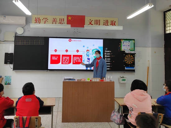 復(fù)學(xué)第一課,各班級(jí)召開防疫主題隊(duì)會(huì),讓學(xué)生們?cè)俅稳媪私庖咔橄嚓P(guān)知識(shí)和防護(hù)措施,做好心理健康教育。