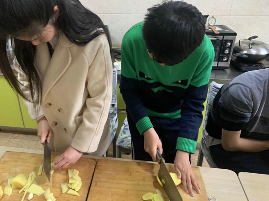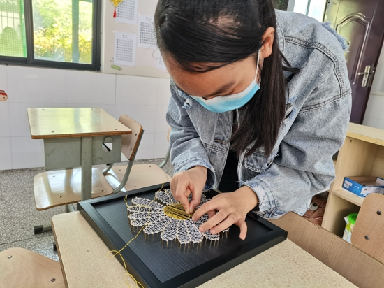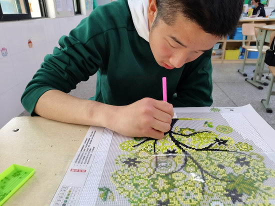 近年來,學校著重培養(yǎng)高年級學生的生活技能,為之后的生活、就業(yè)做準備。勞技課上,同學們學習洗菜、切菜、炒菜、煮面條、熬粥;家政課上,同學們學習整理被褥、疊衣服;手工課上,同學們學習編織、繞釘畫、鉆石畫等手工制作。在老師的幫助下,學生通過不斷地練習,這些勞動技能已經(jīng)可以熟練掌握。