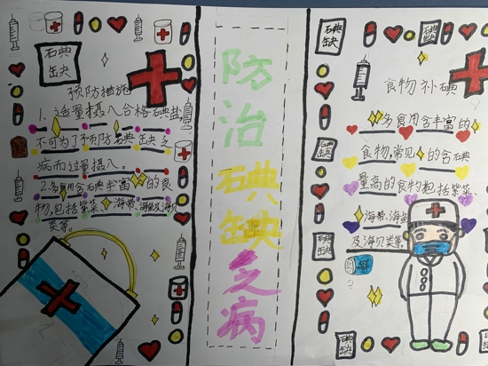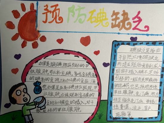 課下,學(xué)生們通過(guò)制作科普手抄報(bào),做起家庭健康宣傳員,向家中的弟弟妹妹、爸爸媽媽宣講防治碘缺乏病的相關(guān)知識(shí),倡導(dǎo)大家科學(xué)飲食,健康飲食。