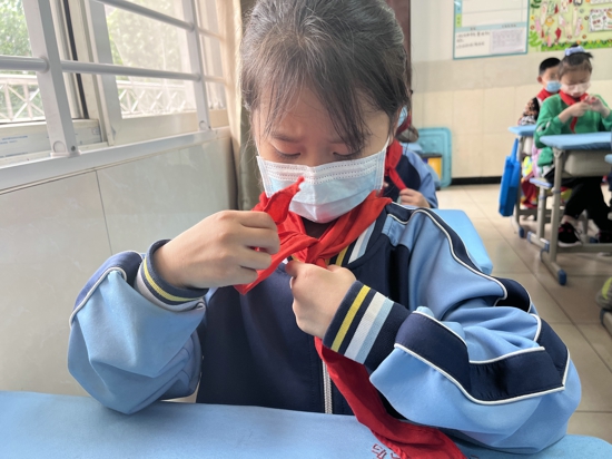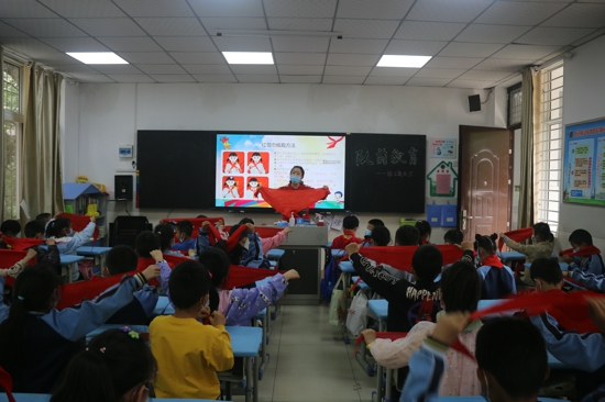 此外,針對入隊(duì)前教育的重點(diǎn)“六知六會一做”,老師們分階段、全方位開展了深入的主題教育。輔導(dǎo)員老師通過圖文并茂與實(shí)操展示的形式介紹了隊(duì)旗、隊(duì)徽、紅領(lǐng)巾的來歷等有關(guān)隊(duì)的知識,讓他們對少年先鋒隊(duì)的知識有了更多的了解,知道了少先隊(duì)的光榮傳統(tǒng),了解了少先隊(duì)的標(biāo)志及其含義,明白了少先隊(duì)員肩負(fù)的責(zé)任。此外,輔導(dǎo)員老師還帶領(lǐng)隊(duì)員們一起練習(xí)如何佩戴紅領(lǐng)巾。“紅領(lǐng)巾是革命先烈的鮮血染紅的,我們每一個隊(duì)員要熱愛并愛護(hù)我們胸前的紅領(lǐng)巾。”輔導(dǎo)員王格格老師向隊(duì)員們說道。