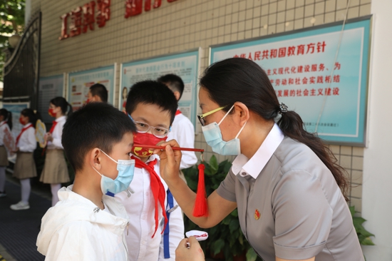 朱砂啟智開天眼,一撇一捺學(xué)做人,學(xué)校領(lǐng)導(dǎo)在校門口為走進校園的每一位“工一娃”點上一顆“智慧”的朱砂。朱砂點落,從此眼明心亮,好讀書,讀好書。顆顆紅“智”飽含著父母、長輩、學(xué)校的殷殷期待和美好祝愿,更凝結(jié)著中華五千年文化的悠悠情節(jié)。