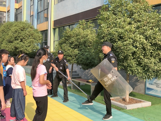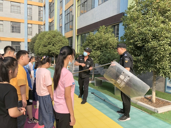 演練結(jié)束,大隊輔導(dǎo)員竇豫琦邀請保安人員為學(xué)生講解各個器械的名稱和用法,教育學(xué)生遇到危險時,要及時向老師和家長求助,記住報警電話110。