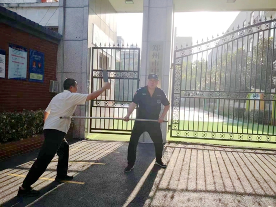 教師正組織學(xué)生在操場活動,有一名持械“歹徒”欲闖進校園,保安迅速進行防范,立即持警棍、盾牌,利用防爆鋼叉極力制止“歹徒”進入校園,最終“歹徒”在校大門口被成功制服。