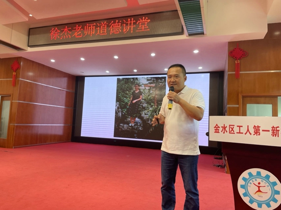 “中國好人”徐杰在開學典禮上面向全體師生發(fā)表倡議,鼓勵同學們勇敢地肩負起個人、家庭以及國家的責任。用奮斗譜寫時代華章,跟隨黨的步伐,和祖國共拼搏、共進步。隨后的講座中,徐杰以充滿激情的語言講述自己見義勇為的事跡。為了救被搶劫的女孩,義無反顧的上前,女孩救下,徐杰卻身負重傷。徐杰非常自豪的對學生說:“如果見義勇為是錯的,那么我將一錯再錯,知錯犯錯。”為了突發(fā)高位截癱的鄰居崔海英,徐杰20年如一日,幫助鄰居清理衛(wèi)生、洗刷大小便盆、洗床單等,信守善行,陪伴著這位老人走完此生。除此之外,多年來,徐杰還長期義務獻血、堅持帶養(yǎng)老院的老人們外出游玩、幫助困難學子、熱心公益慈善捐款、關注環(huán)保宣傳垃圾分類等。徐杰老師的事跡讓同學們感受到深深的震撼,不禁留下了感動的淚水……