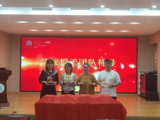 本學(xué)期該校為依托團(tuán)隊的力量,提高各科的教學(xué)質(zhì)量,組建了四個教學(xué)團(tuán)隊:問思辨語文團(tuán)隊、創(chuàng)思數(shù)學(xué)團(tuán)隊、美思藝術(shù)團(tuán)隊、學(xué)思提質(zhì)團(tuán)隊。會上該校校長王瑩和黨支部書記魏志英分別為每位團(tuán)隊授予了稱號。