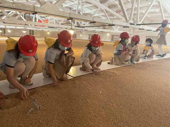 裝備齊全,進(jìn)糧庫。帶好安全帽,放好隨身物品,在講解員和帶隊老師的保護(hù)下,同學(xué)們爬到糧庫內(nèi)部進(jìn)行參觀體驗。糧倉內(nèi)部,工作人員把木板鋪在糧食頂部上以便人員活動。得知腳下是高達(dá)六米的麥子,同學(xué)們無比震撼于糧倉的巨大。在工作人員的講解中,同學(xué)們也了解到了糧食的保存也需要精準(zhǔn)控制溫度、濕度等因素。參觀體驗活動后,同學(xué)們紛紛表示要做厲行節(jié)約、愛糧節(jié)糧的倡導(dǎo)者和示范者,要做勤儉節(jié)約新風(fēng)尚的傳播者和實(shí)踐者。
