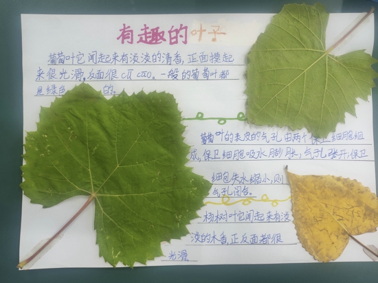 此次活動由學(xué)?茖W(xué)組的教師精心設(shè)計,他們放眼課內(nèi)外,結(jié)合學(xué)情,設(shè)計了具有個性化的科學(xué)紀實活動,深受學(xué)生們喜愛。首先,科學(xué)老師在課堂上用植物葉子的形態(tài)圖,引導(dǎo)孩子們認識各種各樣有趣的植物葉子的形狀;接著,老師指導(dǎo)同學(xué)們通過查閱資料,了解到有些葉子為什么到了秋天就變黃了,有些葉子為什么放入水里觀察會產(chǎn)生許多小氣泡等等有趣的知識。最后,同學(xué)們把在課堂上所了解、感知到樹葉的相關(guān)知識,積極運用到實際生活中,他們認真觀察校園中種植的各種植物的葉子,并分析自己所摘的這一片葉子的形狀、結(jié)構(gòu)和功能,同時借助放大鏡、顯微鏡等工具進一步了解葉子,最終制作出圖文結(jié)合的“有趣的樹葉”介紹圖。