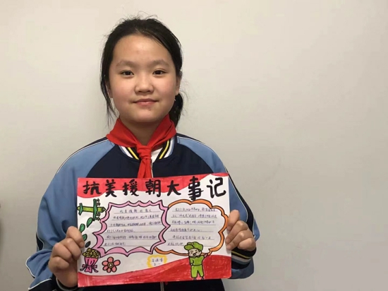 活動中,中隊輔導員老師帶領(lǐng)隊員們回顧了這一段壯烈激昂的歷史歲月,同時向隊員們講述了一段段感人至深的革命故事和一個個革命先烈的英雄事跡。在談及抗美援朝重大歷史意義的時候,五一中隊輔導員王鮮艷講道:“抗美援朝戰(zhàn)爭是新中國成立后中國軍人第一次出國作戰(zhàn),正因為志愿軍戰(zhàn)士們的浴血奮戰(zhàn)才得以保衛(wèi)了祖國的領(lǐng)土安全,同時也打出了我國的國威和軍威,提高了國際聲譽。”隊員們聽得熱血沸騰,大家紛紛表示:要銘記歷史,倍加珍惜今天的幸福生活,身為祖國未來的棟梁,要立志好好學習,長大后做一名對國家、對社會有用的人。