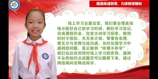 紅領(lǐng)巾小主播們通過國旗下演講,向小伙伴們發(fā)出倡議:在疫情期間,應(yīng)該學會自律,規(guī)劃好自己的學習,制定目標,包括時間作息、學習生活、體育鍛煉、興趣愛好等,并為大家提出了一些自律學習的好方法。隨后,紅領(lǐng)巾小主播分享了學生疫情防控期間《居家防護、學習生活健康指南》具體做法,最后,全體隊員面對屏幕集體宣誓,志之所趨,無遠弗屆。
