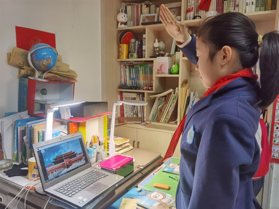 本次升旗儀式的主題為“線上學習不松懈,蓄力成長待花開”。雖是“云端”升旗,但大家心心相連,隔著屏幕也同樣感受到這一刻的莊嚴和神圣。屏幕里,鮮艷的五星紅旗伴隨著國歌聲冉冉升起;屏幕外,師生肅立,高唱國歌,表達對祖國的深深愛意。隊員們不約而同地向著國旗敬隊禮,目之所向,皆是五星紅旗;歌之所唱,皆是愛國力量。