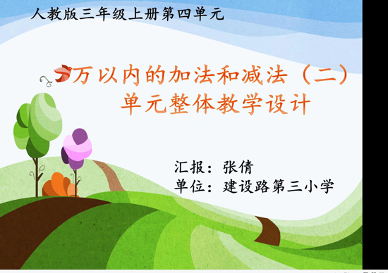 張倩老師結(jié)合三年級上冊《萬以內(nèi)的加法和減法(二)》之《三位數(shù)加三位數(shù)(不進位和一次進位)》單元整體教學(xué)設(shè)計進行分享,闡述了單元整體教學(xué)設(shè)計在課時教學(xué)中的重要作用。