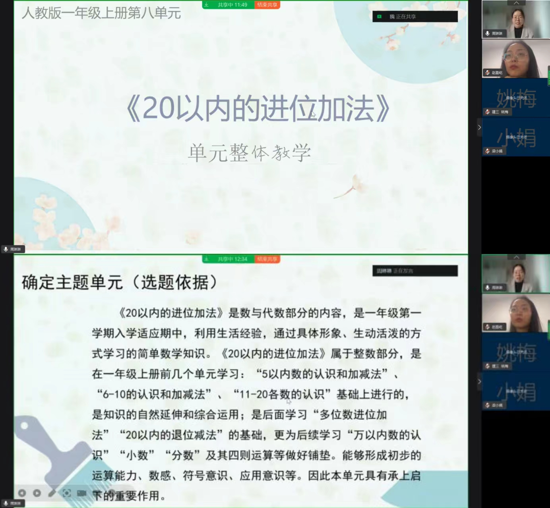 周琳琳老師結(jié)合實踐,匯報了一年級上冊《20以內(nèi)的進位加法》的單元整體教學(xué)設(shè)計,從確定單元主題和建構(gòu)單元大概念兩個方面詳細(xì)闡述了她對單元整體教學(xué)設(shè)計的理解和實施。
