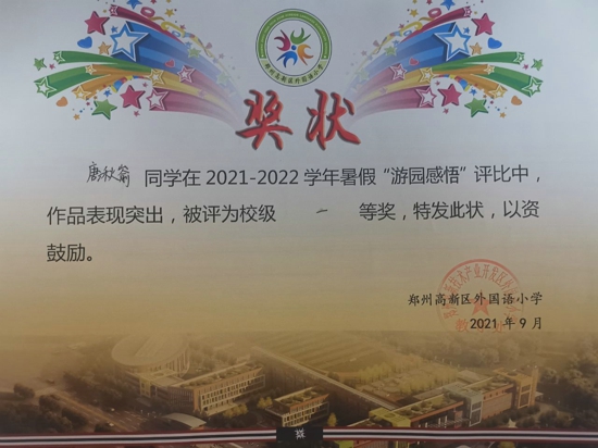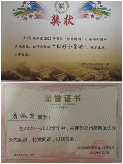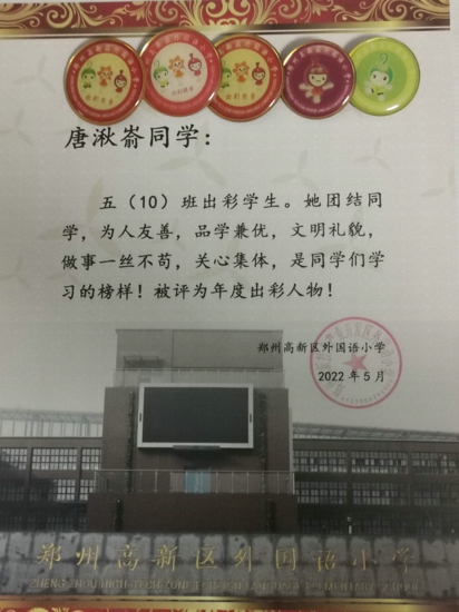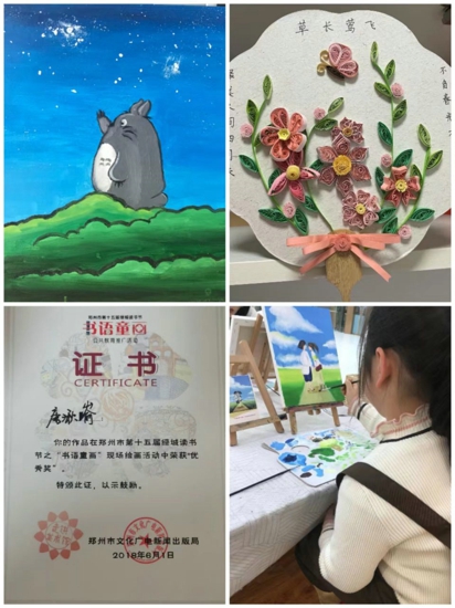 唐湫崳同學(xué)不僅品學(xué)兼優(yōu),還是個(gè)多才多藝的小姑娘。學(xué)習(xí)之余,她喜歡演奏鋼琴,拿到了鋼琴八級證書;她喜歡繪畫,繪畫作品曾獲鄭州市第十五屆“綠城讀書節(jié)之書語童畫繪畫現(xiàn)場活動(dòng)”優(yōu)秀獎(jiǎng),清明詩配畫、重陽節(jié)手抄報(bào)等繪畫作品被?浫;她喜歡做手工,制作的衍紙畫常常使人眼前一亮;她喜歡游泳,暑假每周堅(jiān)持游泳鍛煉......一項(xiàng)項(xiàng)榮譽(yù),如同一個(gè)個(gè)夢想的果實(shí),閃閃發(fā)光。
