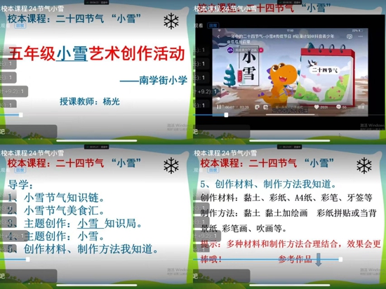 活動前,學(xué)校老師為學(xué)生精心制作了節(jié)氣宣講視頻,帶領(lǐng)學(xué)生了解了小雪節(jié)氣的由來、氣候特點(diǎn)、物候特征、民間習(xí)俗等,讓學(xué)生在愉快的觀賞中了解、感悟小雪節(jié)氣,讓祖國的傳統(tǒng)歷史文化與美德能代代弘揚(yáng)與傳承,讓民族文化根植于每個(gè)學(xué)生的心田。