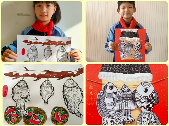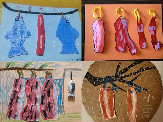 活動中,孩子們在老師的指導(dǎo)帶領(lǐng)下,在家長的幫助下積極參與。語文學(xué)科中,孩子們在老師的帶領(lǐng)下探索與小學(xué)節(jié)氣有關(guān)的詩詞并進(jìn)行朗誦并制作了小學(xué)主題的詩配畫,一起感受那詩韻般的小雪之美;美術(shù)學(xué)科中,老師給孩子們講述小學(xué)節(jié)氣的民俗藝術(shù)活動知識并帶領(lǐng)大家一起創(chuàng)作“曬魚干”“黏土雪人”“臘肉拼貼畫”等美術(shù)作品,讓孩子們在充分了解節(jié)氣知識的同時(shí)豐富美術(shù)創(chuàng)作體驗(yàn);科學(xué)學(xué)科則開展了創(chuàng)意實(shí)踐給小樹穿衣、冷熱空氣對流、人工造雪等科學(xué)小實(shí)驗(yàn),極大地調(diào)動了孩子們的參與積極性;音樂學(xué)科則一起學(xué)習(xí)節(jié)氣歌、表演手勢舞,感受節(jié)氣的別樣韻味;還有勞動課堂上,各班紛紛開展了做糍粑、做臘肉、刨肉湯等勞動實(shí)踐活動,引導(dǎo)孩子們對小學(xué)節(jié)氣的勞動活動有了更深一步的了解。