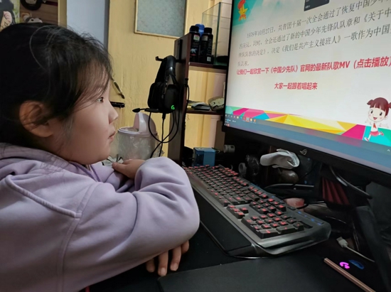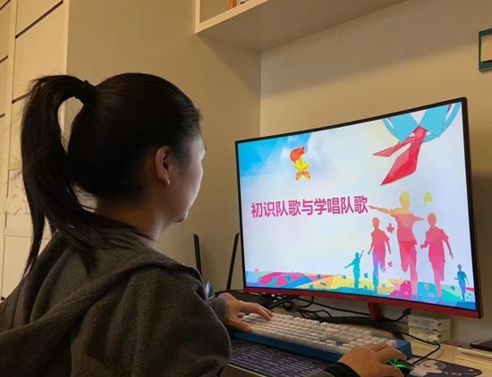 活動(dòng)開(kāi)始前,音樂(lè)老師鄭鵬慧先向一年級(jí)同學(xué)們介紹了隊(duì)歌的創(chuàng)作背景以及隊(duì)歌的變遷,她告訴孩子們?cè)谂e行入隊(duì)儀式、召開(kāi)隊(duì)會(huì)等少先隊(duì)活動(dòng)時(shí),少先隊(duì)員和輔導(dǎo)員老師都要齊唱隊(duì)歌。在講解隊(duì)歌變遷的過(guò)程中,鄭老師帶領(lǐng)孩子們一起在線欣賞了新老隊(duì)歌,讓隊(duì)員們對(duì)隊(duì)歌有了更深的了解。同時(shí),結(jié)合隊(duì)歌的變遷,鄭老師告訴孩子們新隊(duì)歌來(lái)源于革命紅色電影《英雄小八路》并給隊(duì)員們講述了其背后的感人故事。鄭老師告訴隊(duì)員們:英雄小八路的故事原型是廈門(mén)何厝小學(xué)的13位少先隊(duì)員,在金門(mén)炮戰(zhàn)中一邊在硝煙彌漫中堅(jiān)持學(xué)習(xí),一邊深入前線支援革命戰(zhàn)斗的故事,而新隊(duì)歌就是電影《英雄小八路的主題曲》。“隊(duì)歌的含義就是要告訴我們每一名少先隊(duì)員向英雄小八路這樣的少年先鋒榜樣學(xué)習(xí),繼承革命先輩的光榮傳統(tǒng),努力奮斗,取得一個(gè)個(gè)新的偉大成就。”鄭鵬慧說(shuō)道。