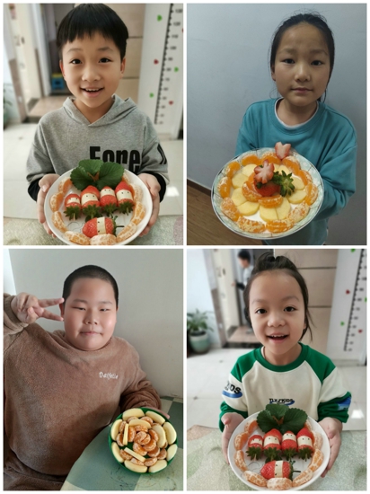 小手準(zhǔn)備好食材,樂享廚藝我最棒。一二年級(jí)的小嫩芽們積極參與,各顯神通,跟著爸爸媽媽學(xué)習(xí)簡單的烹飪技能。擇菜、洗菜,搟餃子皮、包餃子,削水果、擺拼盤……巧手慧心,分享美食。瞧!這些富有創(chuàng)意的果蔬拼盤、美味甜點(diǎn),都出自小嫩芽們靈巧的小手哦,一起來為他們點(diǎn)贊吧!