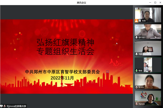 中新河南網(wǎng)11月29日電(吳勇強(qiáng))為深入學(xué)習(xí)宣傳貫徹二十大精神和黨和國家領(lǐng)導(dǎo)人視察安陽重要講話精神,深刻領(lǐng)會紅旗渠精神的豐富內(nèi)涵和時代價值,弘揚紅旗渠精神,賡續(xù)紅色血脈,不斷增強(qiáng)鄭州市中原區(qū)育智學(xué)校黨支部的組織力、凝聚力、戰(zhàn)斗力,更好發(fā)揮共產(chǎn)黨員先鋒模范作用,11月28日,鄭州市中原區(qū)育智學(xué)校黨支部組織全體黨員線上召開“弘揚紅旗渠精神”專題組織生活會。