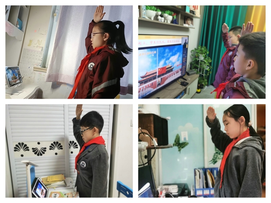 居家防疫不忘使命,心系祖國你我同行。伴隨著嘹亮的國歌聲,五星紅旗冉冉升起。全體師生肅然而立,滿懷自豪和熱愛向國旗敬禮,共赴國旗之下的莊嚴約定。