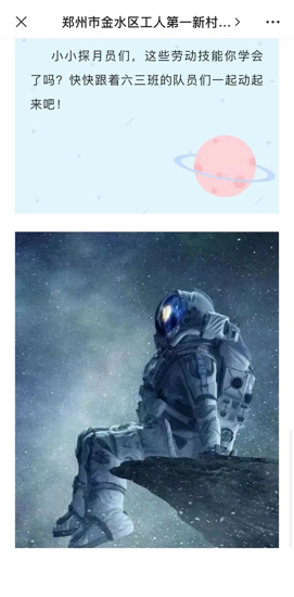 “2033年,人類阻擋小行星撞擊地球的計(jì)劃失敗了,人類面臨滅頂之災(zāi),而被遺忘在月球上的你(中等動(dòng)物研究員獨(dú)孤月)幸運(yùn)的活了下來,成為人類‘最后的希望’。為了能在月球更好地存活,你必須開始鍛煉生存技能,F(xiàn)在,讓我們跟著××班探月指戰(zhàn)員的腳步,學(xué)習(xí)月球生存技能吧!”同學(xué)們的生活活動(dòng)以2022年火熱電影《獨(dú)行月球》為情境展開,按照班級(jí)進(jìn)行勞動(dòng)技能展示。同學(xué)們化身小小探月員,展示的同學(xué)們則化身探月指戰(zhàn)員,用生動(dòng)的語言、科幻的背景,引領(lǐng)同學(xué)們帶著任務(wù),帶著興趣進(jìn)入勞動(dòng)的世界。