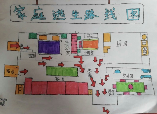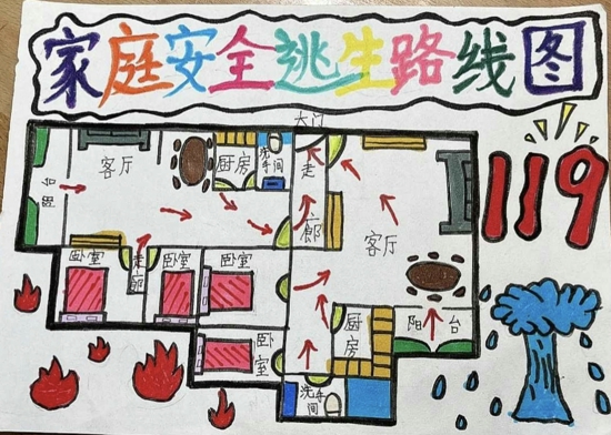 首先,學(xué)生們根據(jù)自己家樓層特點(diǎn)找到正確的逃生出口,然后,清晰地標(biāo)注出每一條逃生路線,最后,詳細(xì)地繪出火災(zāi)初起時(shí)的應(yīng)對(duì)措施,如及時(shí)撥打119,避開電梯從樓梯逃生等,可謂精彩紛呈。