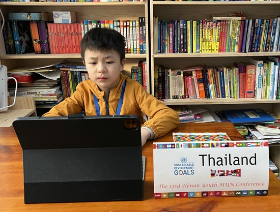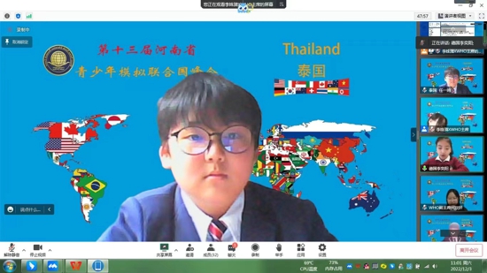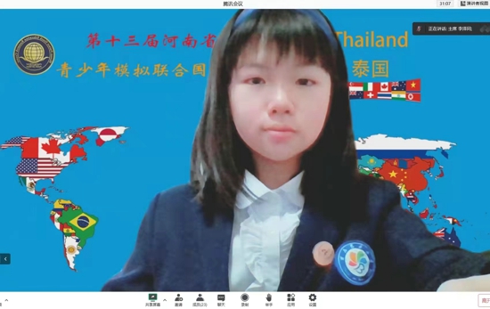 中新河南網(wǎng)12月7日電(吳勇強(qiáng) 任鈺童)12月3日,為期兩天的第十三屆河南省青少年模擬聯(lián)合國(guó)峰會(huì)在線(xiàn)上拉開(kāi)了帷幕。鄭州市中原區(qū)百花藝術(shù)小學(xué)五名學(xué)生代表作為泰國(guó)外交官參加了此次活動(dòng),與河南省26所中小學(xué)和教育單位的近500名學(xué)生一起模擬聯(lián)合國(guó)的議事規(guī)則,深入探討聯(lián)合國(guó)可持續(xù)發(fā)展目標(biāo)。