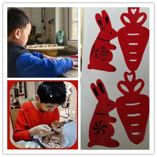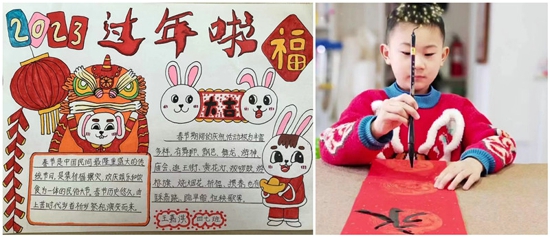 知年味,體會傳統(tǒng)中國年。學(xué)生們紛紛以“兔年”為元素,畫兔、剪兔、寫兔……和家人一起貼春聯(lián),收集“中國年”的相關(guān)知識制作圖文并茂的手抄報(bào),將自己對新年的祝福和期盼寓于其中。有書法基礎(chǔ)的同學(xué)揮毫潑墨,寫下一幅幅春節(jié)對聯(lián),感受漢字的魅力,體會中華春節(jié)文化的內(nèi)涵。