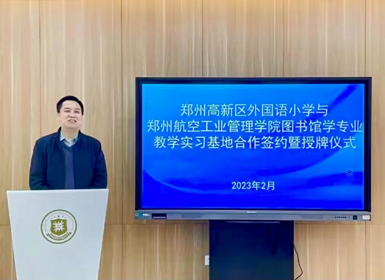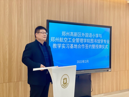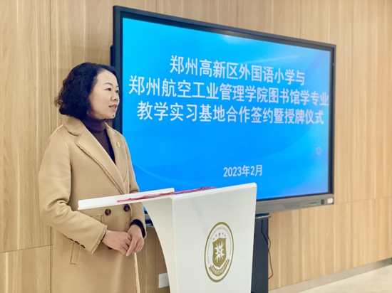 儀式上,外國語小學(xué)校長劉娜對參加本次活動的領(lǐng)導(dǎo)和嘉賓表示熱烈歡迎,并對外小的出彩教育理念、書香校園建設(shè)、閱讀課程建構(gòu)與實(shí)施,以及各方面取得的優(yōu)秀成果進(jìn)行了詳細(xì)介紹。劉校長提出,鄭州航院圖書館學(xué)專業(yè)選擇外國語小學(xué)作為實(shí)踐教育基地,是對本校辦學(xué)成果的充分認(rèn)可,希望兩校在合作中達(dá)成協(xié)同育人的愿景,助力學(xué)校圖書管理工作更好發(fā)展,有效促進(jìn)學(xué)生閱讀課程更加深入。