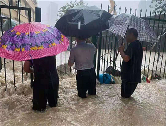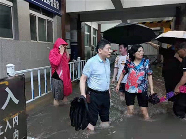 戰(zhàn)斗驚心動(dòng)魄。20日下午14時(shí)30分,由于雨勢(shì)迅猛,東明路校區(qū)排水能力有限,校區(qū)積水明顯增加,最深處約50cm。部門(mén)負(fù)責(zé)人王浩然、張瑩兩位同志冒雨對(duì)校區(qū)內(nèi)的主要交通道路、學(xué)生宿舍、餐廳、超市、青年公寓樓,家屬院等區(qū)域進(jìn)行防澇防汛排查,經(jīng)分析研判,認(rèn)為是由于進(jìn)修樓通道路面排水受阻導(dǎo)致。為保證校區(qū)排水通暢,他們立即組織保衛(wèi)處人員利用木棒,梯子等工具對(duì)疫情防控時(shí)封閉的校區(qū)北門(mén)進(jìn)行破拆,并安排專(zhuān)人密切監(jiān)視水位變化情況。在大家的共同努力下,校區(qū)積水奔涌而出,水位明顯下降。下午16時(shí),由于降雨持續(xù),校區(qū)南側(cè)金水河漫堤,校園積水迅速增加!困難面前,兩位同志立即進(jìn)行了工作分工,王浩然趟著齊腰深的積水,負(fù)責(zé)查看主要排水口情況,張瑩同志負(fù)責(zé)查看學(xué)生宿舍樓情況。此時(shí)家屬院15、16號(hào)樓地下室已沒(méi)入水中,東南處積水已達(dá)到肩膀處,約150cm,學(xué)生餐廳一樓水深至腰部,2號(hào)學(xué)生宿舍樓一層宿舍則全部進(jìn)水,積水深至床板。17時(shí)左右,金水河水在沖毀河道管理處房屋后倒灌入校園內(nèi),校區(qū)積水迅速上升,最深處達(dá)160cm。大量河水倒灌造成東明校區(qū)兩棟宿舍樓、學(xué)生餐廳、配電房、洗浴中心均有不同程度進(jìn)水,平均水深40cm。其中2號(hào)學(xué)生宿舍樓距離金水河潰口僅有4米,一樓宿舍全部被淹,水深70cm,物料漂浮,滿(mǎn)目狼藉,情況萬(wàn)分危急,形勢(shì)異常嚴(yán)峻!按照校黨委書(shū)記別榮海、校長(zhǎng)許二平等校領(lǐng)導(dǎo)的要求,學(xué)校東明辦、保衛(wèi)處、后勤服務(wù)中心等部門(mén)的同志統(tǒng)籌安排、通力協(xié)作,克服重重困難,迅速對(duì)學(xué)生進(jìn)行了轉(zhuǎn)移安置,全力確保師生安全;同時(shí),派專(zhuān)人嚴(yán)密監(jiān)視金水河潰口情況,想盡一切辦法防止水位繼續(xù)上升,造成更加嚴(yán)重的后果。晚上19時(shí)許,400余名學(xué)生全部轉(zhuǎn)移安置完畢,同時(shí)切斷了校區(qū)電源,對(duì)學(xué)校超市、洗浴中心,餐廳等場(chǎng)所的職工進(jìn)行了安全疏散。20日夜間,在防汛設(shè)備、人員物資缺乏,無(wú)法聯(lián)系公安消防等外部救援力量的危急情況下,王浩然、張瑩、楊結(jié)實(shí)等帶領(lǐng)保衛(wèi)處等部門(mén)的同志,利用床板等現(xiàn)有工具多次嘗試圍堵金水河潰口,但由于潰口較大,水流湍急,一直未能成功。為防止校區(qū)積水情況進(jìn)一步惡化,他們徹夜堅(jiān)守崗位,嚴(yán)密監(jiān)視潰口及校園各處情況,保證在汛情發(fā)展后能夠第一時(shí)間進(jìn)行處置。