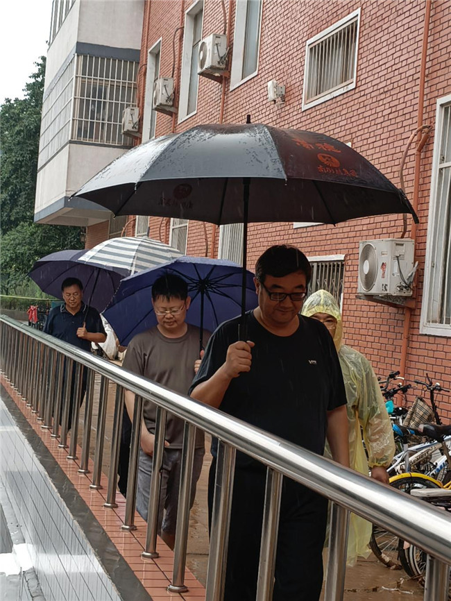 執(zhí)行董事王新奇、副校長(zhǎng)張金安、副校長(zhǎng)張其武冒雨查看校園汛情