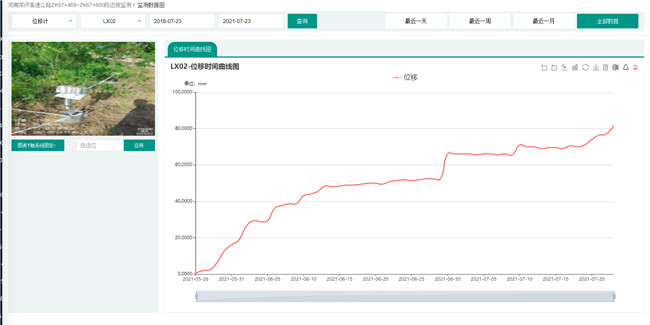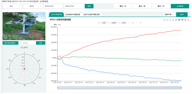 欒盧高速K67左側(cè)邊坡(處于六標(biāo)段施工范圍內(nèi))位于水流匯集的溝口區(qū)域,雨季匯水較多,坡體含水豐富,監(jiān)測(cè)系統(tǒng)施工初期坡頂便出現(xiàn)了近圓弧形裂縫,長(zhǎng)約150m。2021年5月下旬,交院技術(shù)集團(tuán)在欒盧高速滑坡高風(fēng)險(xiǎn)點(diǎn)(K67左幅)布設(shè)自主研發(fā)的“通導(dǎo)遙+基礎(chǔ)設(shè)施地質(zhì)安全監(jiān)測(cè)預(yù)警系統(tǒng)”,實(shí)時(shí)監(jiān)測(cè)邊坡變形情況。