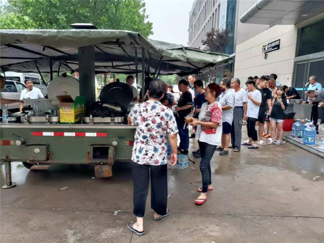 受暴雨洪災(zāi)影響,如何在停水停電狀態(tài)下保障餐食供應(yīng)成為關(guān)鍵難題。交院技術(shù)集團臨時成立炊事班,啟用了事先由百力誠信息科技有限公司捐贈的"炊事神器"——軍用移動炊事車(“移動廚房”),滿負荷烹飪運轉(zhuǎn),解決了停水停電狀態(tài)下的熱食供應(yīng)。