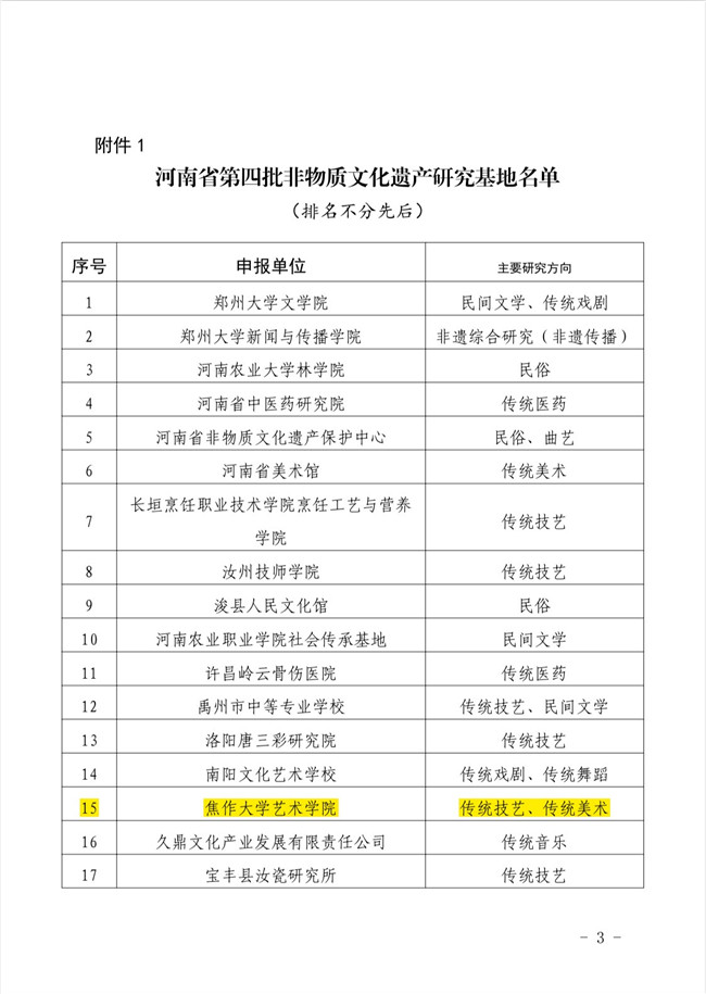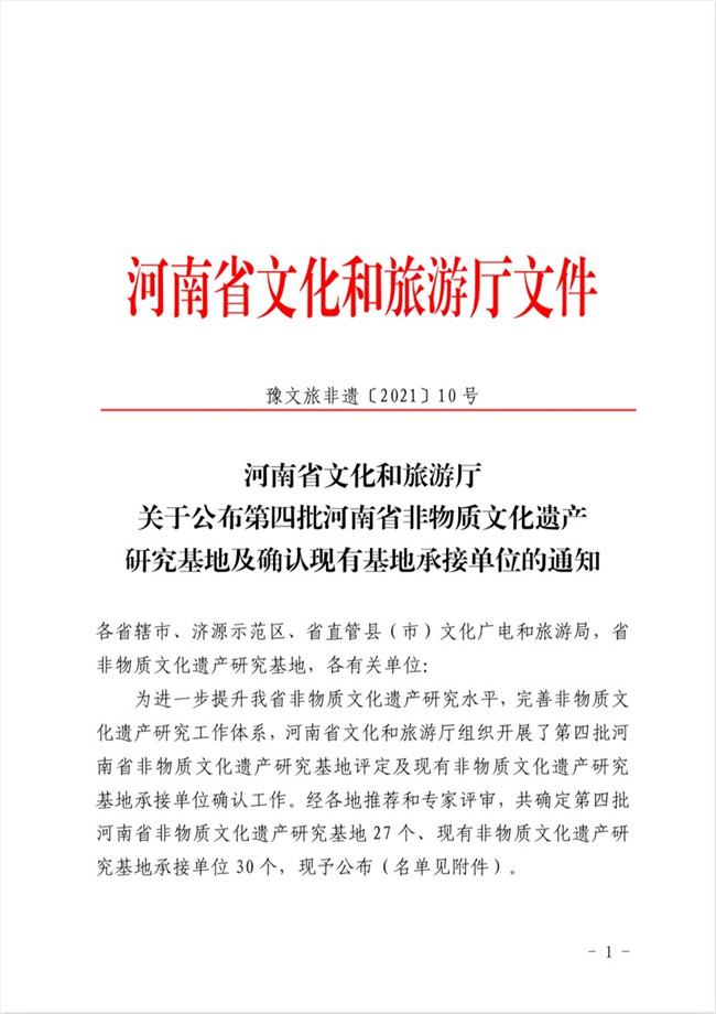 中新河南網(wǎng)7月29日電(魏豪)7月26日,河南省文化和旅游廳《關(guān)于公布了第四批河南省非物質(zhì)文化遺產(chǎn)研究基地及確認(rèn)現(xiàn)有基地承接單位的通知》(豫文旅非遺〔2021〕10號(hào)文件),焦作大學(xué)藝術(shù)學(xué)院名列其中,成功入選河南省非物質(zhì)文化遺產(chǎn)研究基地,該校校再增添一省級(jí)科研平臺(tái)。