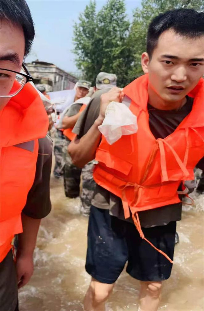 7月23日,因泄洪、決堤等因素,鶴壁市淇縣下屬鄉(xiāng)鎮(zhèn)水位內(nèi)澇,北陽鎮(zhèn)部分村莊水位高達頸部,其他部分村莊水位達到腰部,情況十分緊急,多數(shù)老人、學(xué)生和兒童被困。“群眾遭難,人民受苦,作為一名退伍大學(xué)生,豈能袖手旁觀?”在災(zāi)難面前,孫逸冰主動請纓,成為淇縣退役士兵志愿救援隊中的一員,在隊長臧凱的組織下,他帶上縣武裝部提供的皮劃艇、救生衣、探照燈等救援裝備,第一時間對鶴壁市淇縣北陽鎮(zhèn)水屯村、玖州國際物流園等多村莊進行人員搜救和轉(zhuǎn)移。“舉起幼小的嬰兒、背起白發(fā)老人、拉著困難百姓……”這是孫逸冰參與救援時的真實寫照。經(jīng)過連夜數(shù)個小時的英勇奮戰(zhàn),他救援和轉(zhuǎn)移物流園群眾約150人。