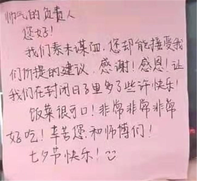 中新河南網(wǎng)8月18日電(魏豪 白雪玲)“帥氣的負(fù)責(zé)人,您好!我們素未謀面,您卻能接受我們的建議......讓我們?cè)诜忾]的日子里多了些許快樂!飯菜很可口,非常非常好吃!......七夕節(jié)快樂!”